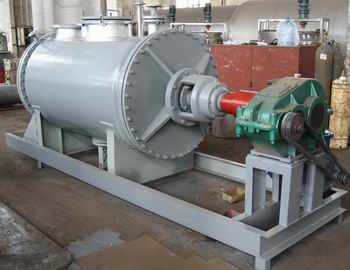 具有結構簡單,操作方便,使用周期長,性能穩定可靠,蒸汽耗量小,適用性能強,產品質量好,特別適用于不耐高溫、易燃、調溫下易氧化的膏狀物料的干燥,該機經用戶長期使用證明是一良好的干燥設備。原理:被干燥物料從殼體上方正中間加入,在不斷正反轉動的耙齒的攪拌下,物料軸向來回走動,與殼體內壁接觸的表面不斷更新,受到蒸汽的間接加熱,耙齒的均勻攪拌,粉碎棒的粉碎,使物料表面水分更有利的排出,氣化的水分經干式除塵器、濕式除塵器、冷凝器,從真空泵出口處放空。結構:真空耙式干燥機的主要部件